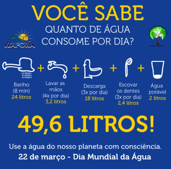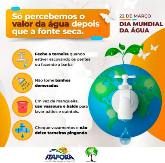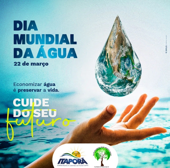 Cumpre a cada um se conscientizar de que, assim como o ar e a terra, a água é um bem natural imprescindível à sobrevivência e perpetuação da vida. Por isso, a Secretaria Municipal de Meio Ambiente e Turismo de Itaporã-TO, convoca a todos para que comemorem esse dia e reflitam sobre as próximas gerações, que dependem das ações tomadas hoje para usufruírem de um mundo sustentável no futuro.